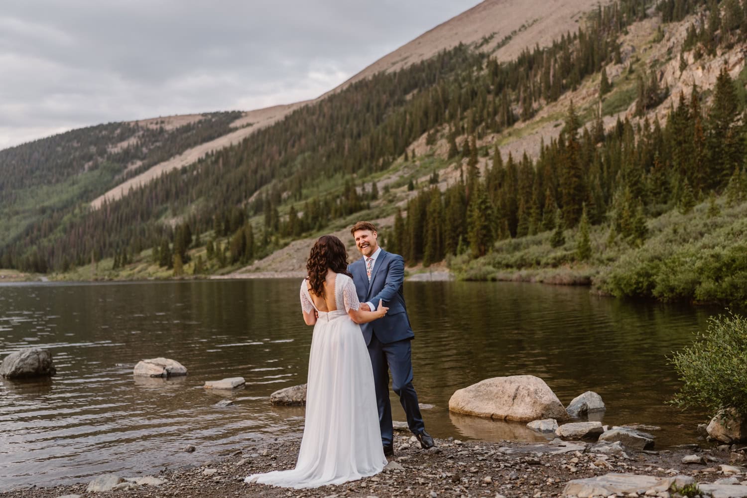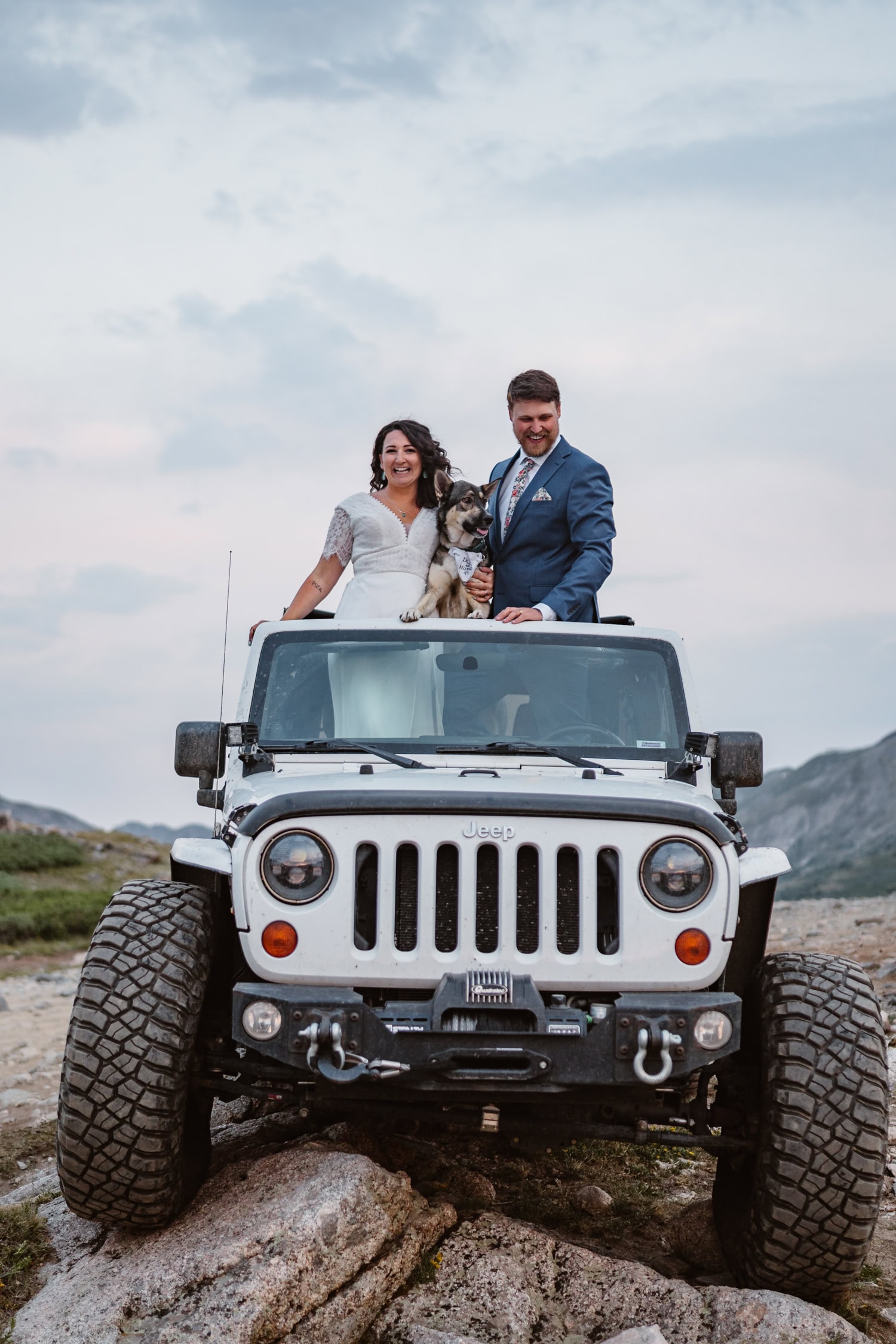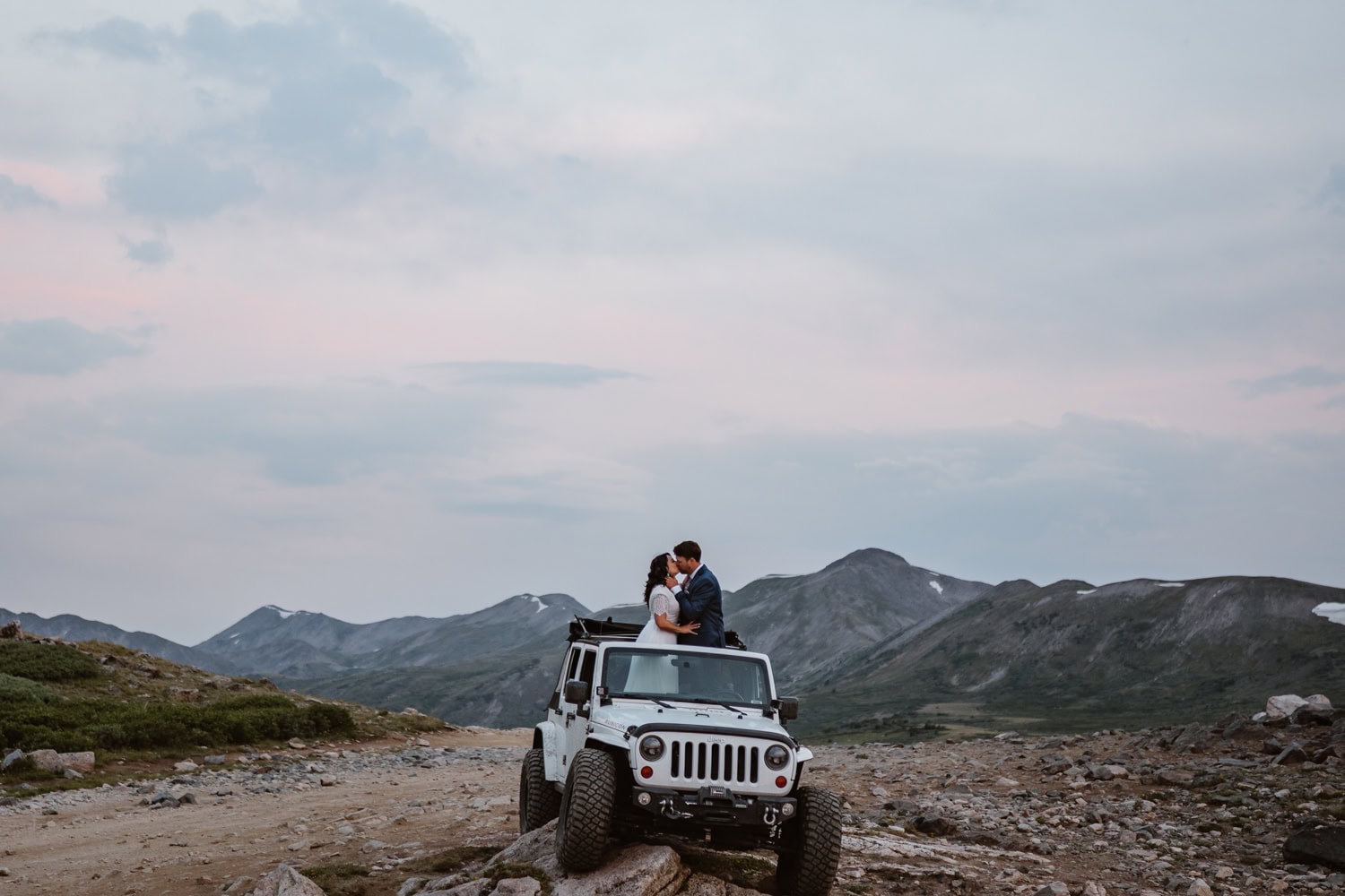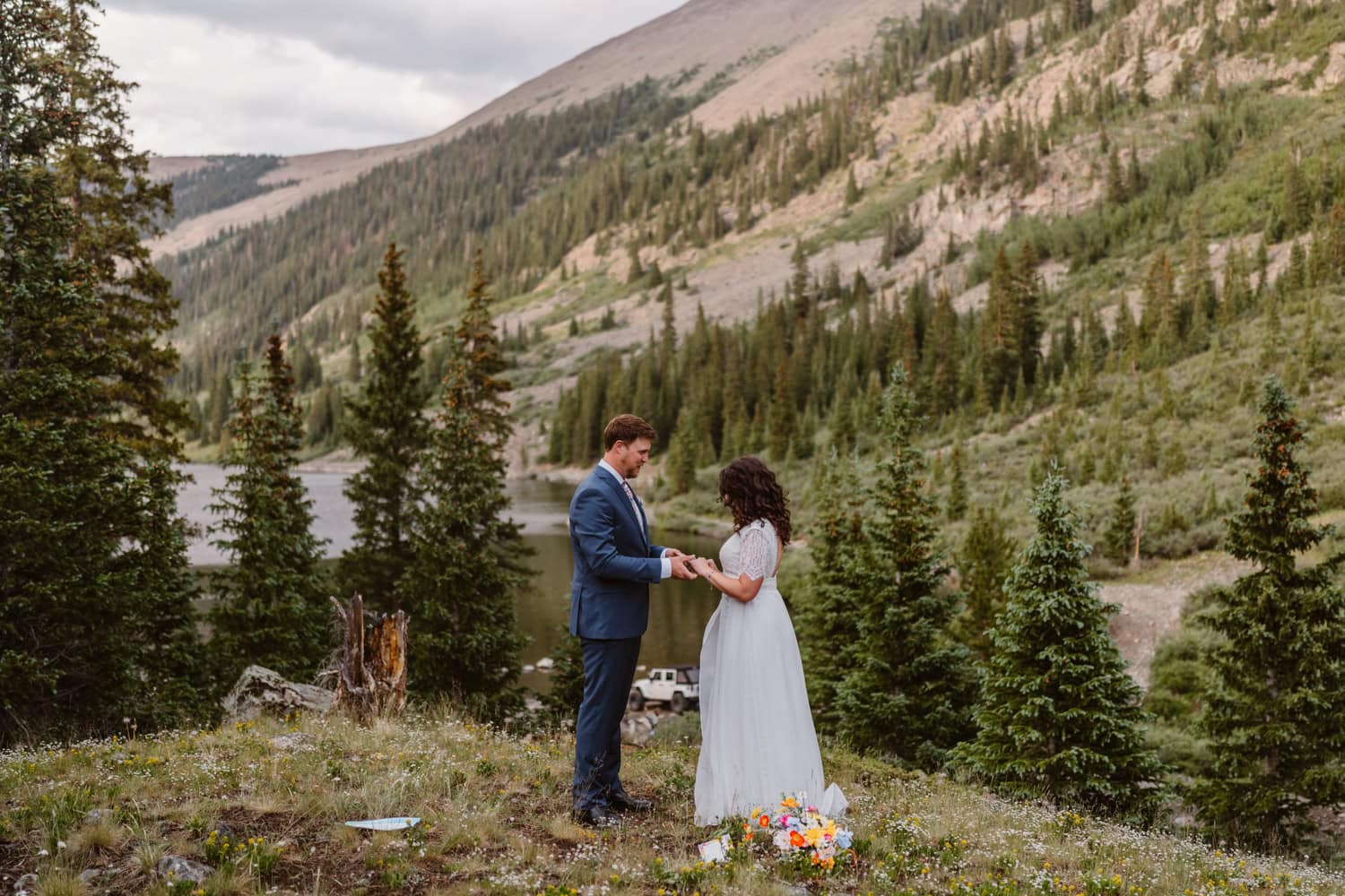 We drove up as the rain rolled in and started the day with a quiet first look by the lake. From there, we piled into Kelly’s Jeep and off roaded up the pass, swapping stories about how they met at the drag races while the weather closed in around us.