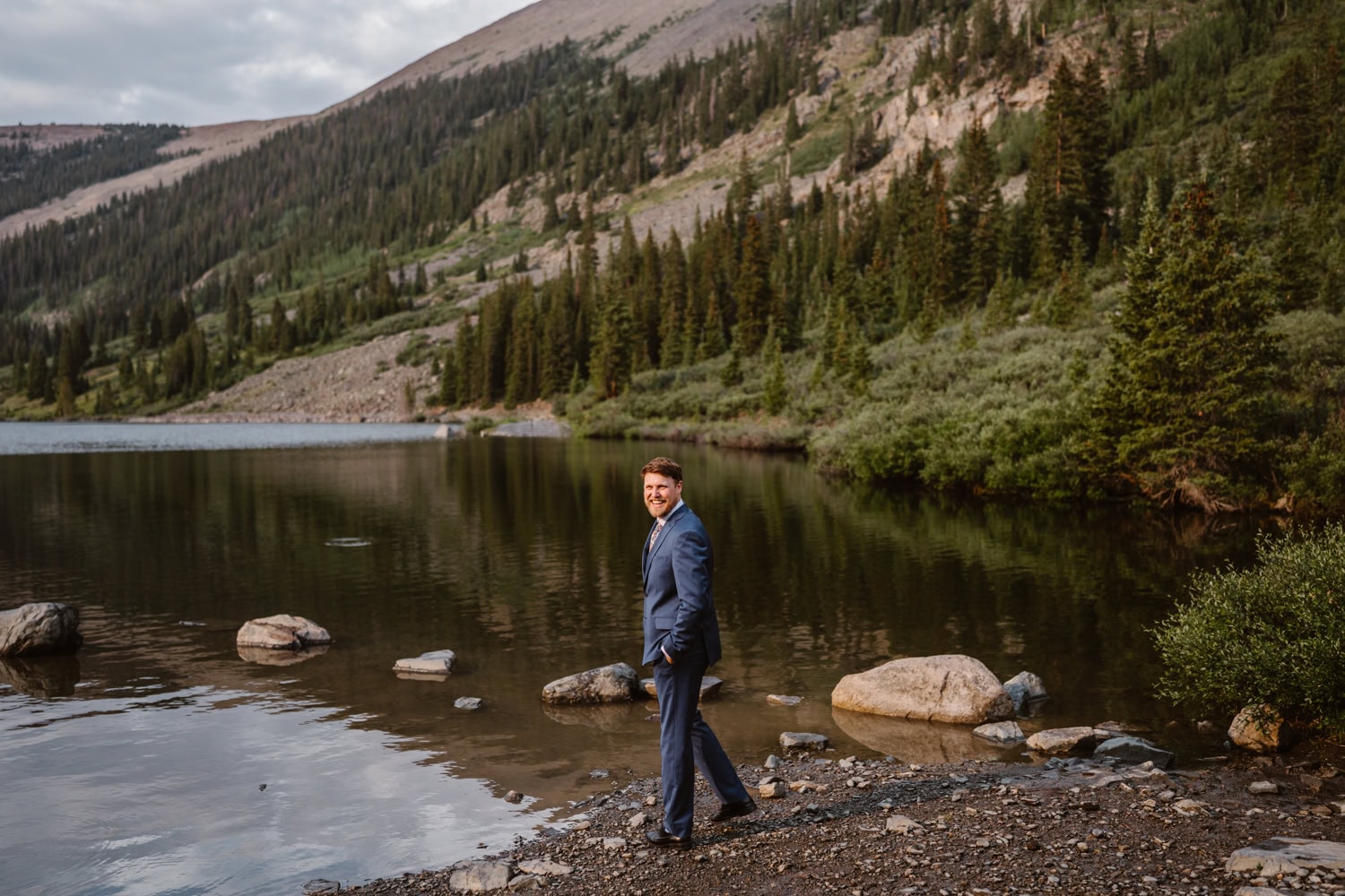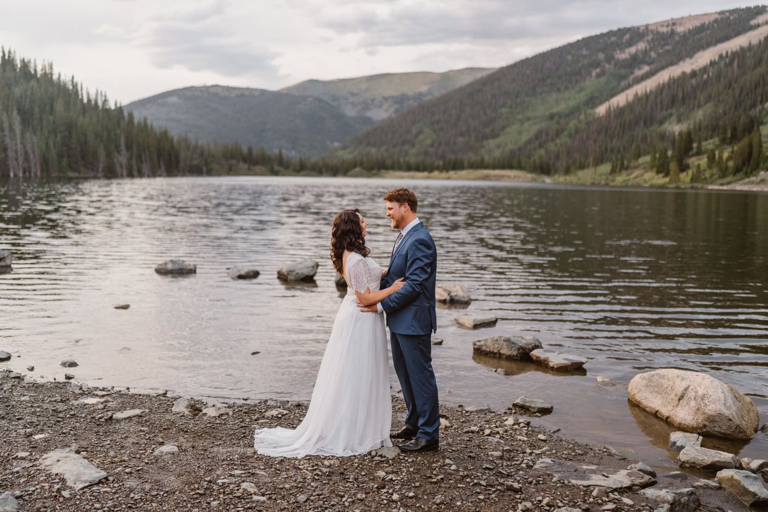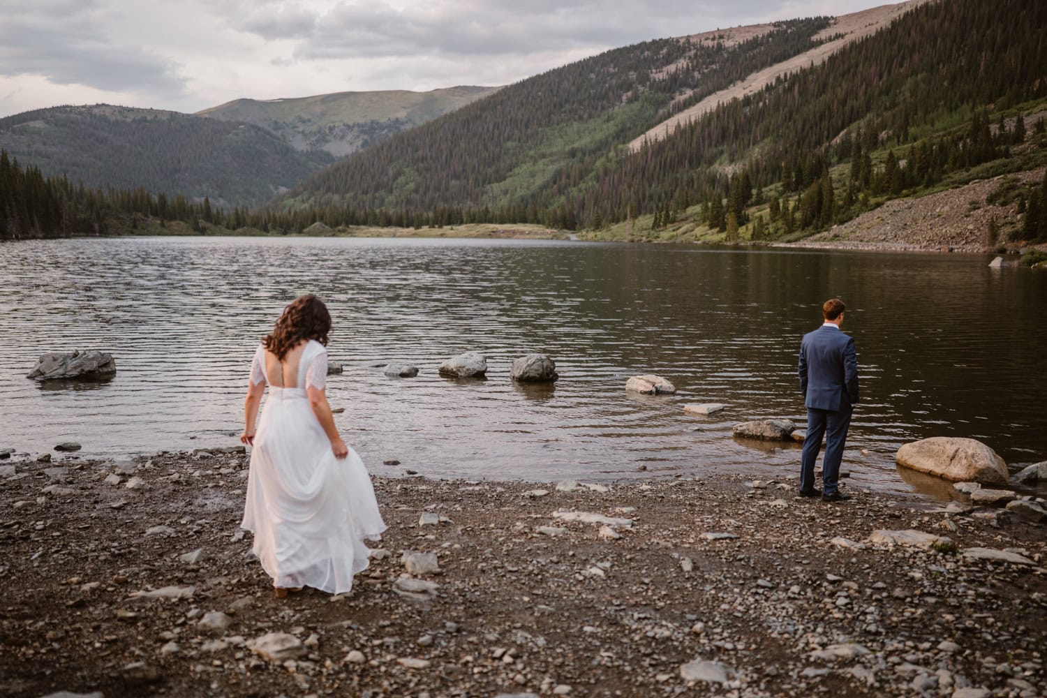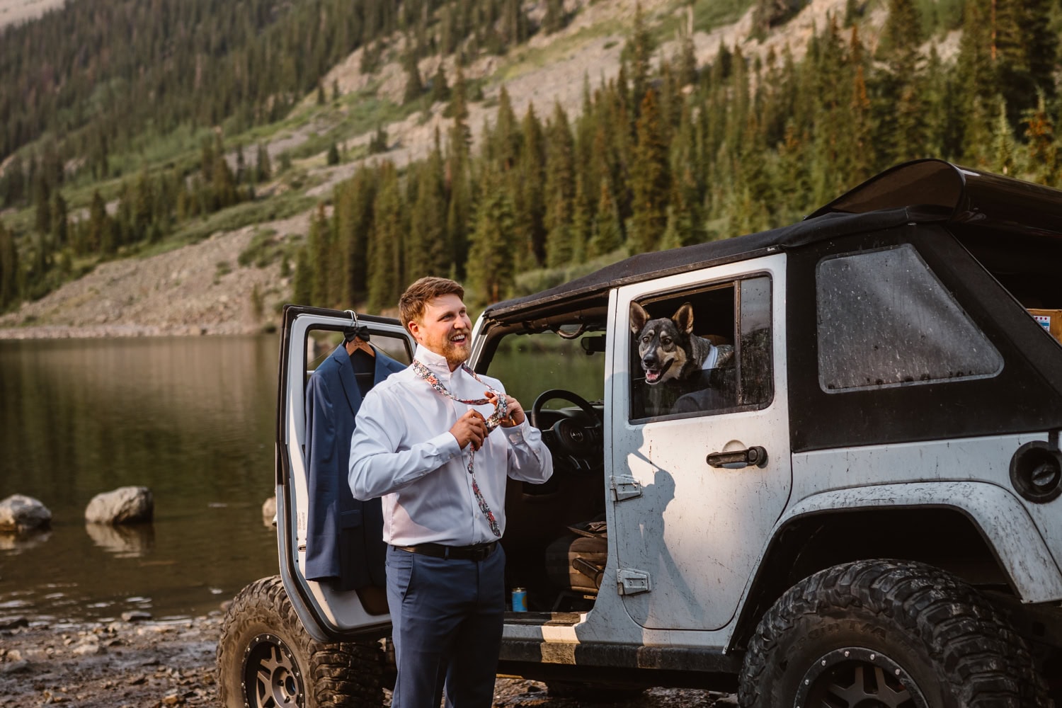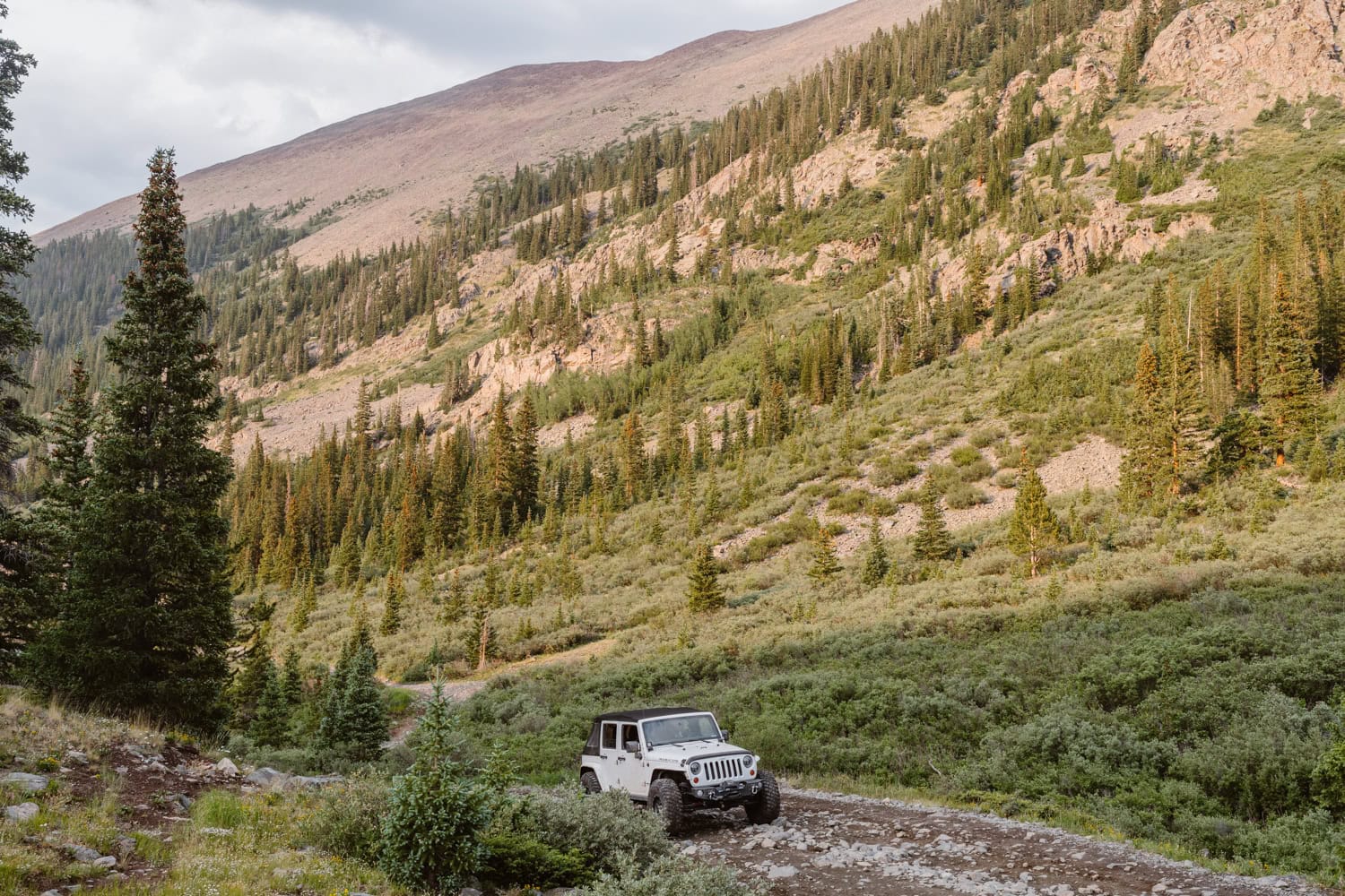 We drove up as the rain rolled in and started the day with a quiet first look by the lake. From there, we piled into Kelly’s Jeep and off roaded up the pass, swapping stories about how they met at the drag races while the weather closed in around us.