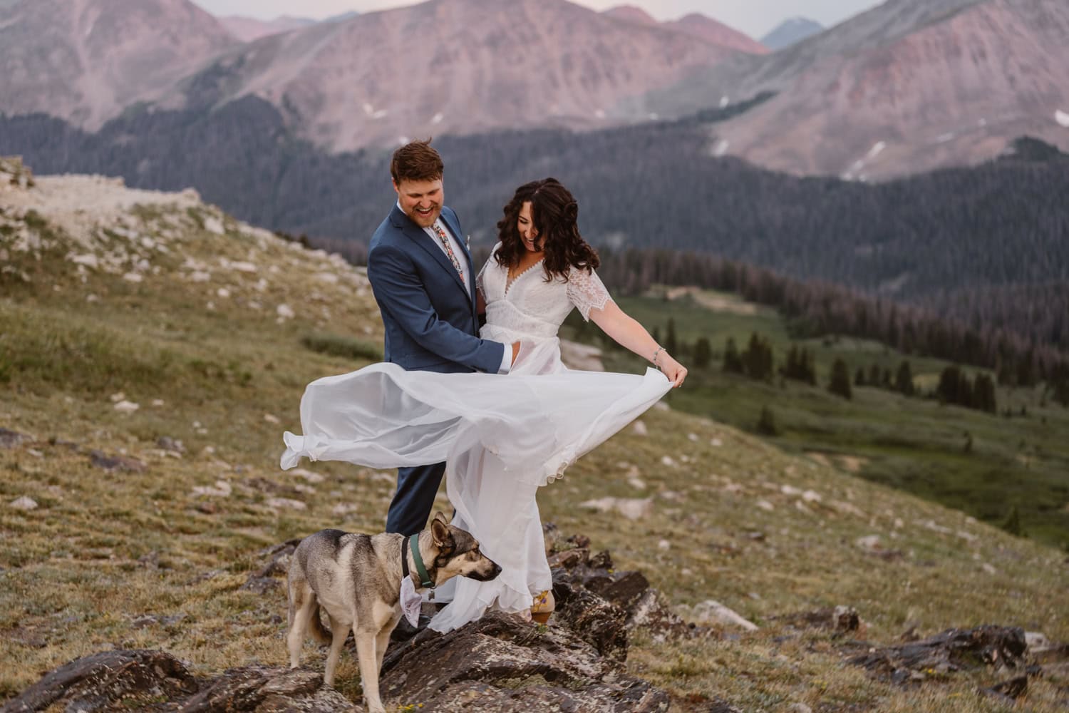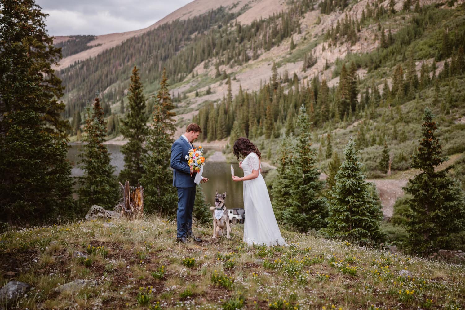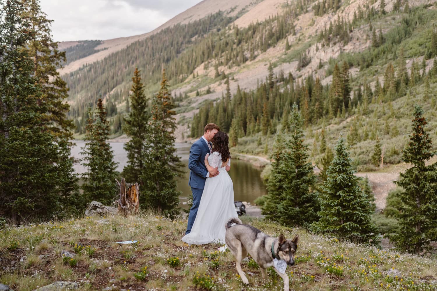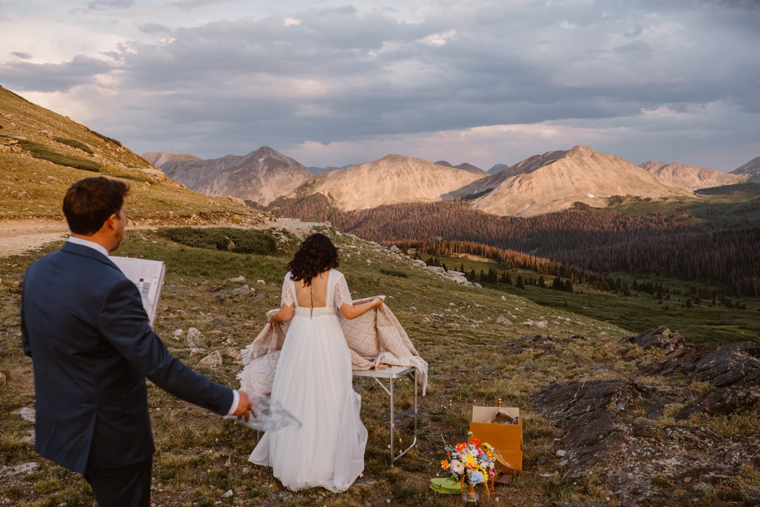 We pulled over near a massive field of wildflowers where they exchanged vows with their dog by their side—simple, personal, and deeply meaningful. Higher up the pass, they shared a picnic and wandered through sunset light for couples photos before heading back down the mountain.