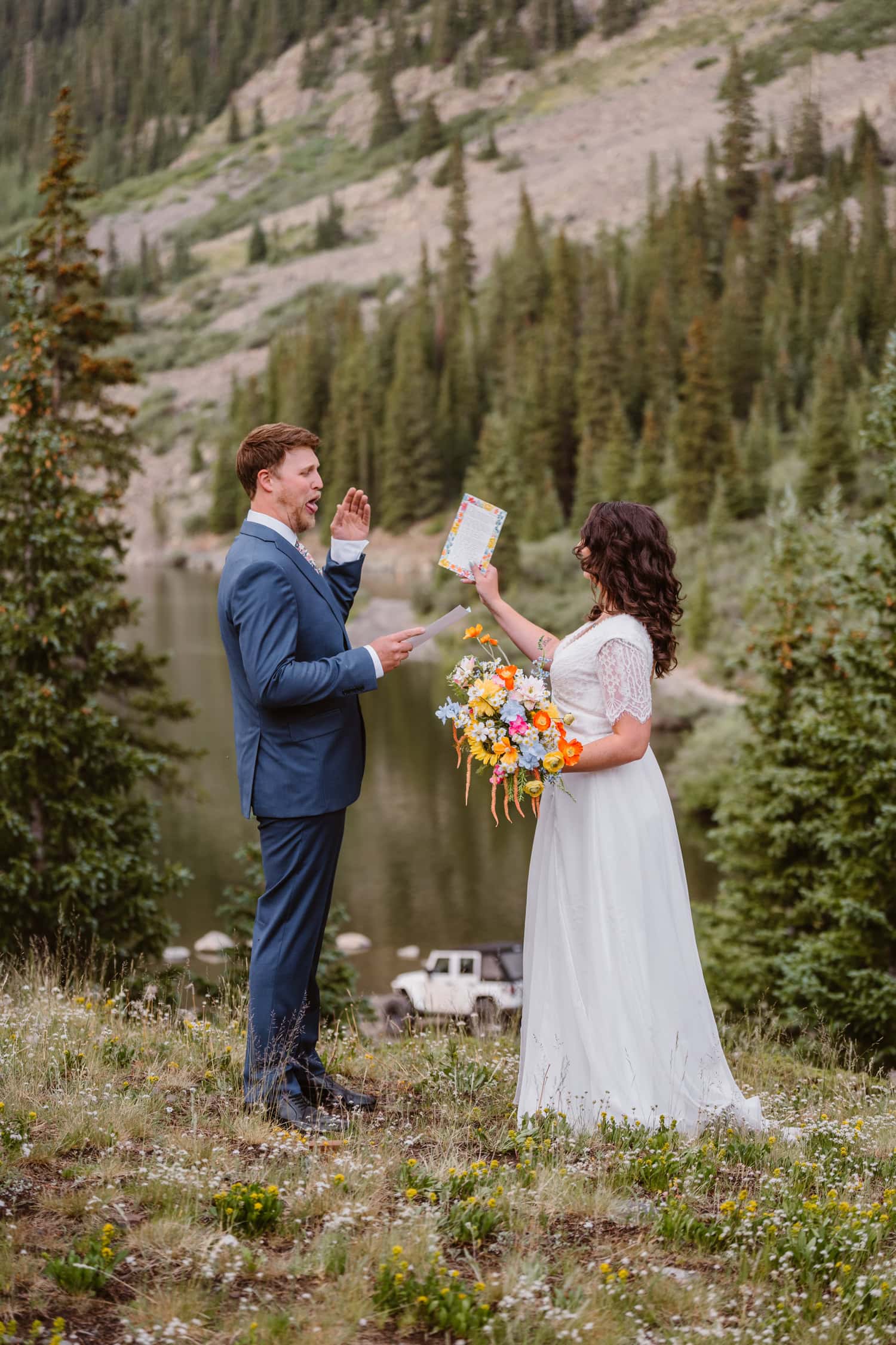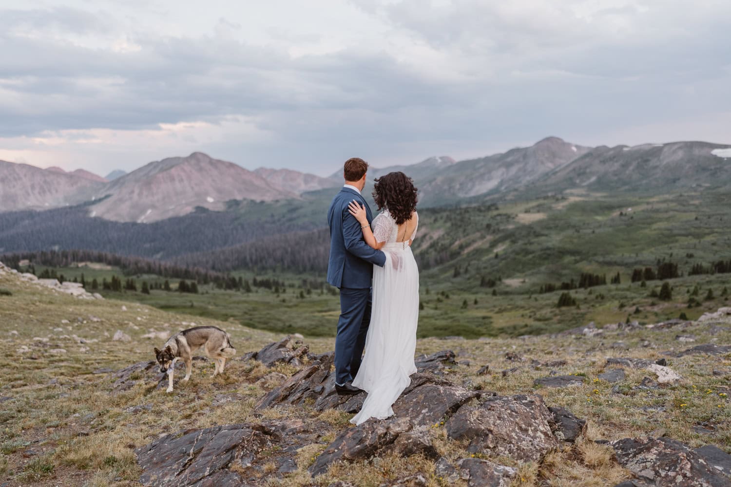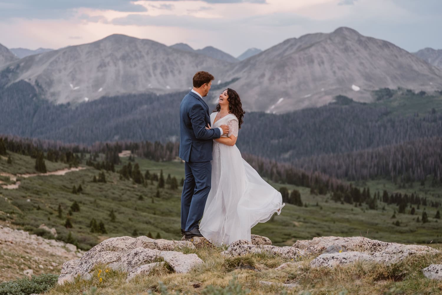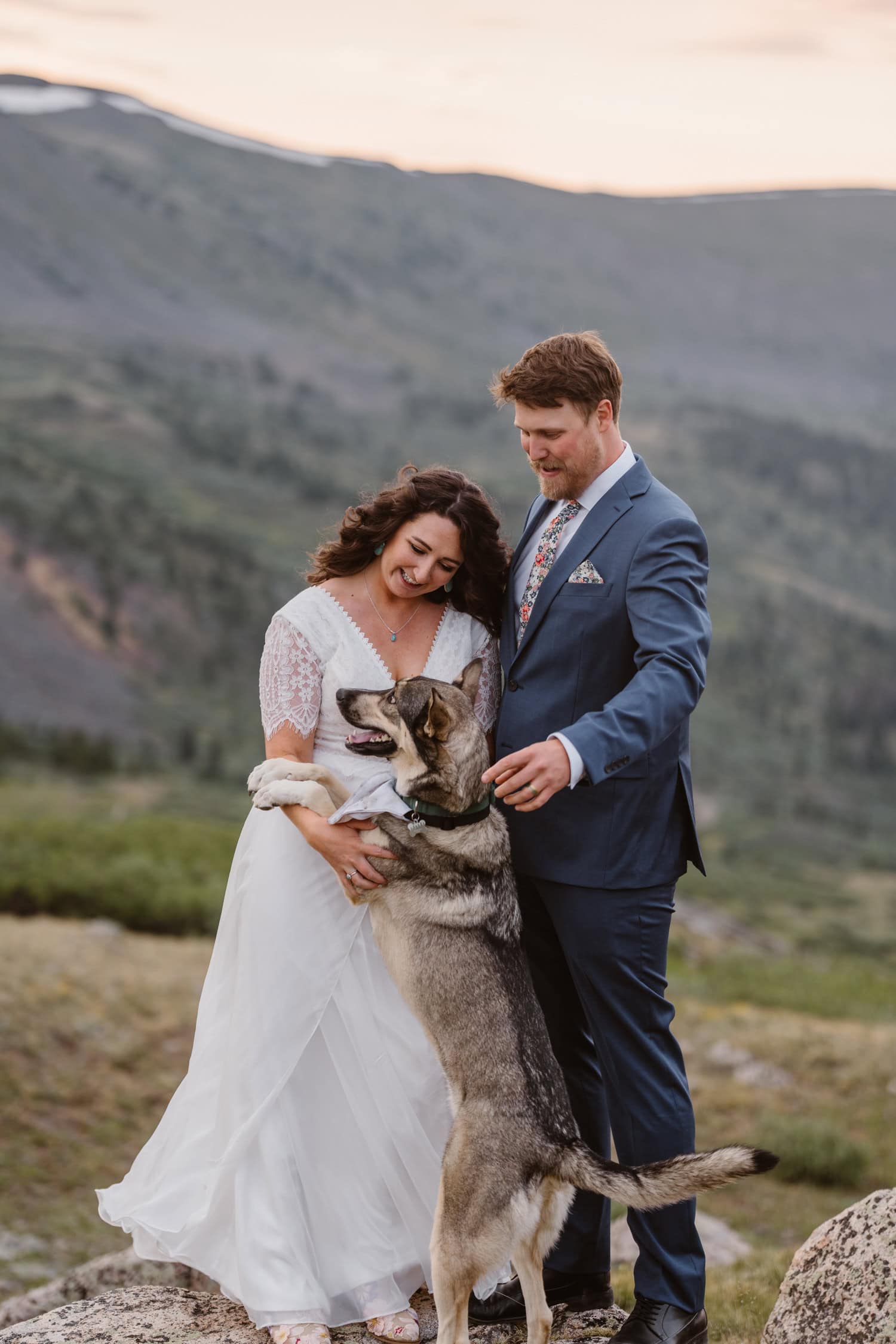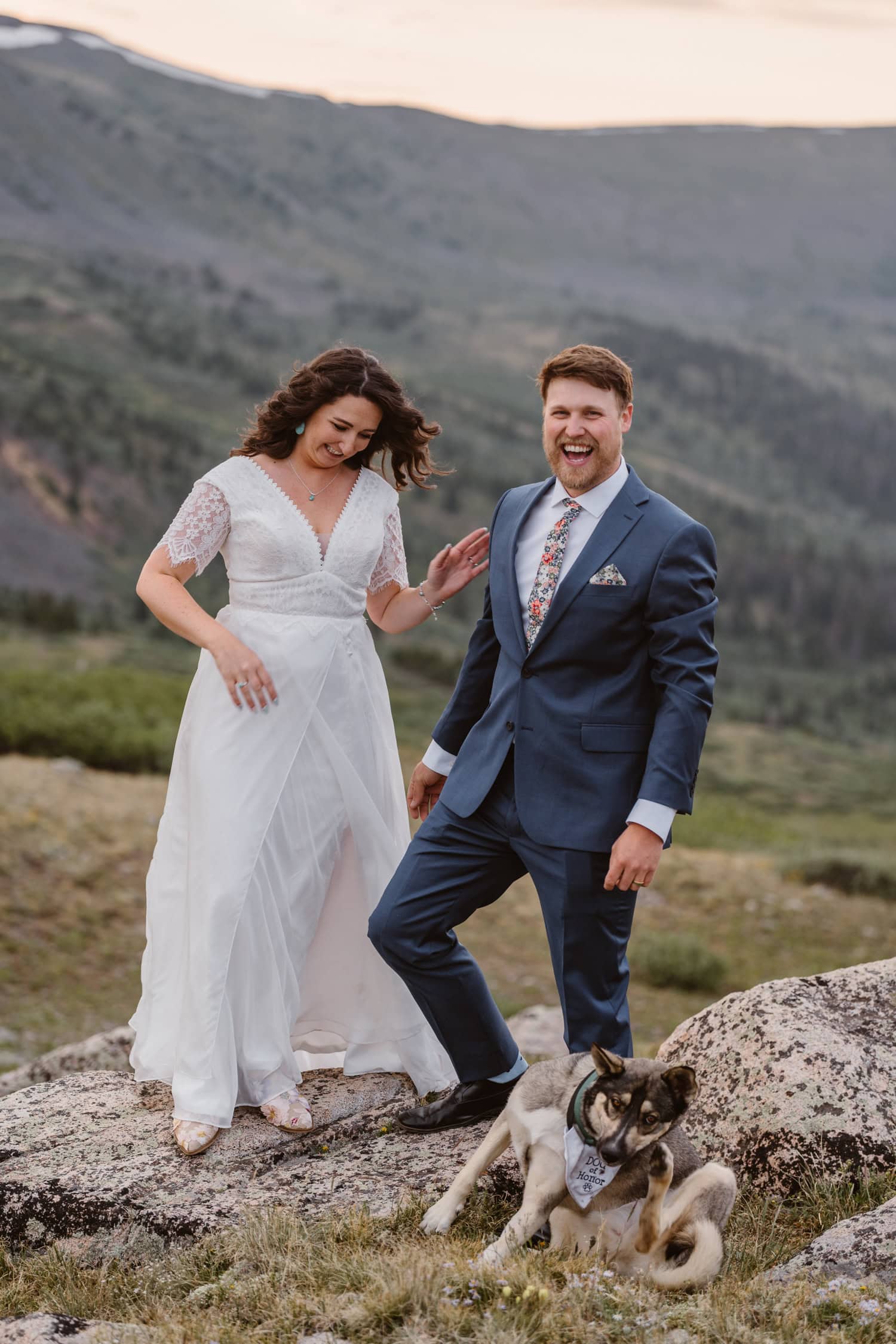 We pulled over near a massive field of wildflowers where they exchanged vows with their dog by their side—simple, personal, and deeply meaningful. Higher up the pass, they shared a picnic and wandered through sunset light for couples photos before heading back down the mountain.